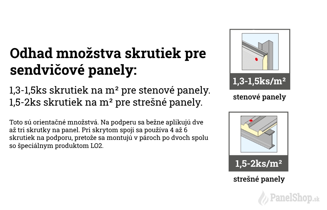 14. Pri stenových skrutkách sa používa približne 1,3 skrutky na m² a pri strešných skrutkách 1,5 skrutky na m². Toto sú orientačné množstvá. Na podperu sa bežne aplikujú dve až tri skrutky. Pri skrytom spoji sa používa 4 až 6 skrutiek na podporu, pretože sa montujú v pároch po dvoch spolu so špeciálnym produktom LO2.